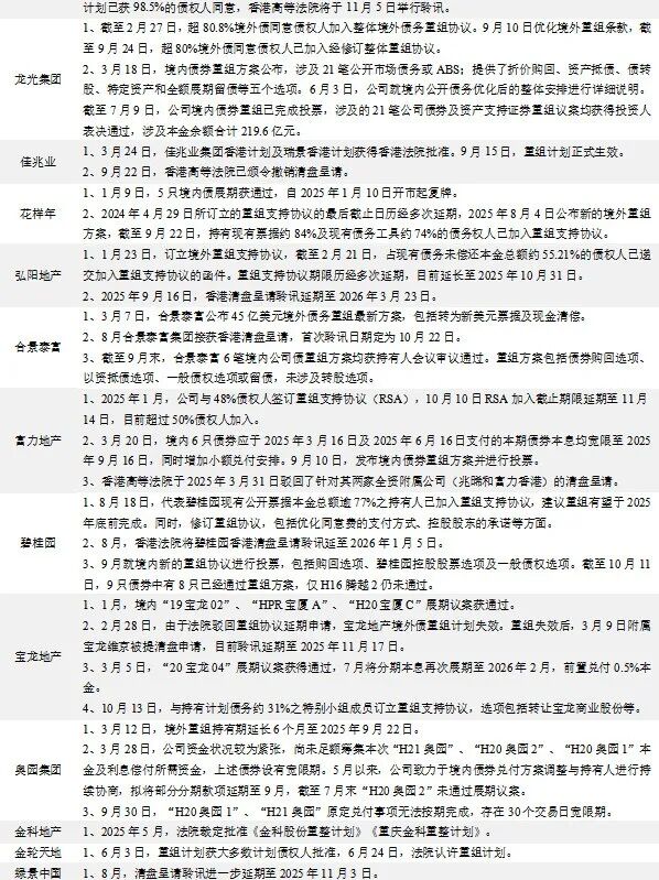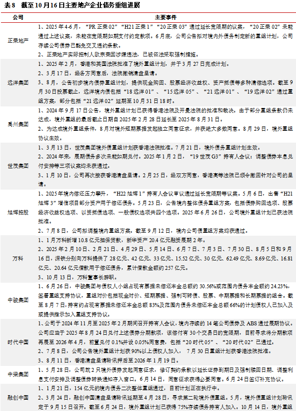 地产企业重组进展,(1)境内方面。重组加速推进。三季度前期通过境外重组协议的企业,加速推进境内债券重组。例如,远洋集团目前部分债券通过,旭辉控股、禹州集团、龙光集团和合景泰富全部债券通过,其中,旭辉集团调整境内方案后通过,包括提高转股规模、现金购回和以资抵债的对价,增设同意费等。此外,目前,大部分出险地产企业对存续债务进行整体重组,个别企业重组谈判难度较大,整体重组工作尚未有实质性进展,例如,宝龙地产、正荣地产。(2)境外方面。部分发行人继续优化重组方案以获得持有人支持。例如,碧桂园8月优化境外同意费支付方式(在特定情形下可以以股份支付)和控股股东承诺等条款(股东贷款转为股权并设置限售条件和最低持股条件);龙光优化境外重组条款,包括增设资产信托用于抵债和扩大转股规模,目前超80%境外债同意债权人已加入重组计划;花样年修订2024年重组方案,目前84%已加入重组计划,此外,部分公司境外重组/展期通过,例如,禹州集团为通过重组协议再次对短期票据发起独立同意征求并获通过,推动重组计划生效;中梁集团存续2只票据通过完成同意征求;融创中国重组计划获债权人必要同意待聆讯。(3)非标债务方面。在境内外债券重组计划通过后,部分企业开始针对境内外其他债务进行展期谈判。例如,世茂集团境内外部分贷款先后获得展期。(4)清盘压力。债务重组通过的企业,清盘呈请可申请撤销,例如,世茂集团、远洋集团、佳兆业。目前,绿景中国、宝龙地产、景瑞控股等企业依然面临清盘压力。
