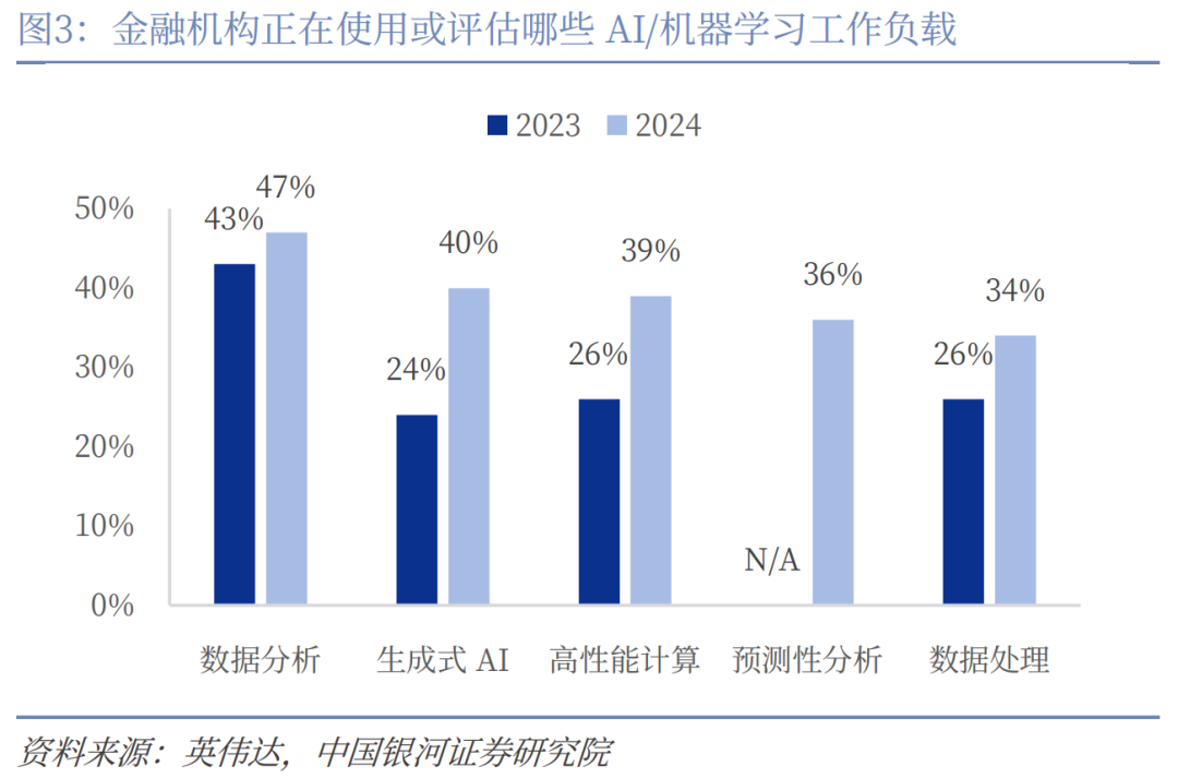 金融业作为典型的数据密集型和技术密集型行业,依托其海量高质量数据与丰富业务场景,已成为人工智能技术应用最为成熟和广泛的领域之一。人工智能正全面渗透金融业务链条,在多个环节发挥关键作用:通过智能风控重塑信用评估体系,依托智能投顾实现资产配置优化,运用智能客服提升金融服务普惠水平。金融机构正加速从“业务数字化”向“数字业务化”的战略转型,构建以数据驱动为核心的新型运营范式。英伟达对中国近300家金融机构的调研显示,43%的机构已开始应用大模型。
