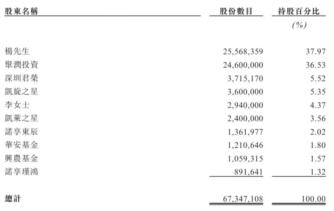 IPO前,杨帆持股为37.97%,聚润投资持股为36.53%,深圳君荣持股为5.52%,凯旋之星持股为5.35%;