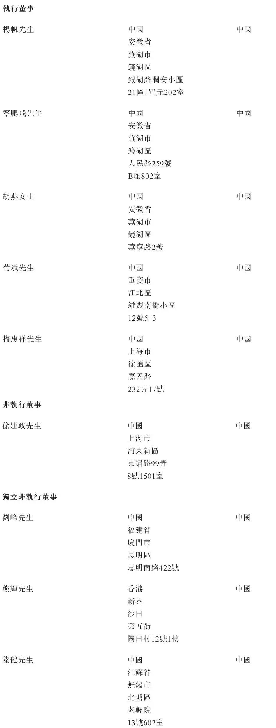 溜溜果园执行董事分别为杨帆、宁鹏飞、胡燕女士、苟斌、梅惠祥;非执行董事为徐连政,独立非执行董事分别为刘峰、熊辉、陆健。