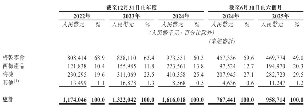 溜溜果园2025年上半年来自梅干零食收入4.7亿,占比49%;来自西梅产品收入为1.95亿元,占比20.3%;来自梅冻收入2.83亿,占比29.5%。