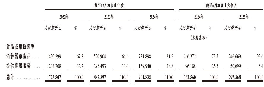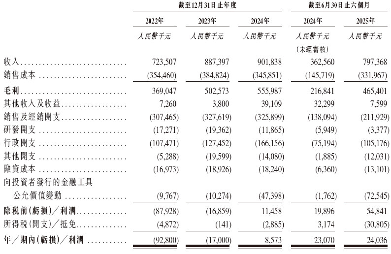 招股书显示,在过去的2022年、2023年、2024年和2025年前六个月,维健医药的营业收入分别人民币7.24亿、8.87亿、9.02亿和7.97亿元,相应的净利润分别为人民币-9,280万、-1,700万、857.3万和2,403.6万元。
