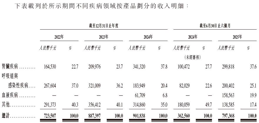 维健医药已打造多元且差异化的产品组合,广泛覆盖肾脏与血液疾病领域,并延伸至呼吸系统及皮肤疾病等其他重大疾病领域。根据灼识咨询的资料,维健医药目前的产品组合涵盖六种肾脏药物,是中国制药企业中治疗肾脏疾病商业化原研药数量最多的企业。