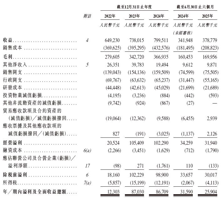 招股书显示,在过去的2022年、2023年、2024年和2025年前六个月,科拓股份的营业收入分别人民币6.49亿、7.38亿、8.00亿和3.79亿元,相应的净利润分别为人民币1,230.3万、8,703.0万、8,670.9万和2,590.4万元。