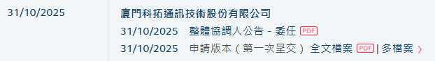 2025年10月31日,来自福建厦门软件园的厦门科拓通讯技术股份有限公司KEYTOP PARKING INC.(下称“科拓股份”)在港交所递交招股书,拟在香港主板上市。这是继其于2025年4月28日递表失效后的再一次申请。