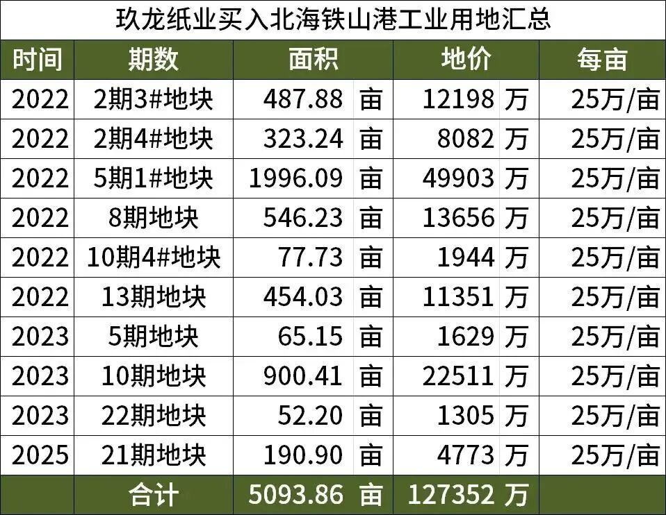 算上今年的21期地块,从2022年开始,玖龙纸业在北海共分10次买入了5093.86亩工业用地,买地的总费用,达到12.7352亿元。玖龙这样的用地大户,北海很难再有第二个了。