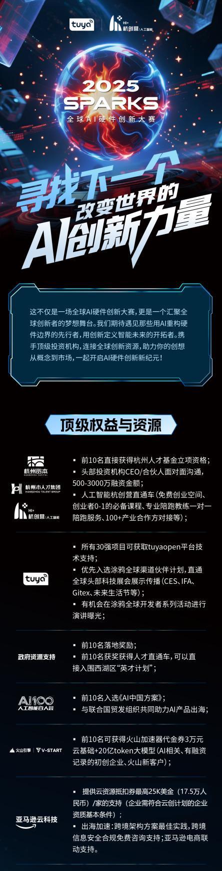 11月18日,“2025 SparkS全球AI硬件创新大赛”正式启动。大赛是由属地政府和杭州市人才集团、杭创(人工智能)营、涂鸦智能(TUYA.US)等联合打造的高能级赛事,依托杭州市AI产业高地、杭创(人工智能)营平台聚合的创新创业资源及涂鸦全球化开发者生态,面向全球招募具备商业化潜力的AI硬件项目,聚焦“AI硬件”与“应用场景”两大关键环节,打通从技术创新到产业落地的“最后一公里”。