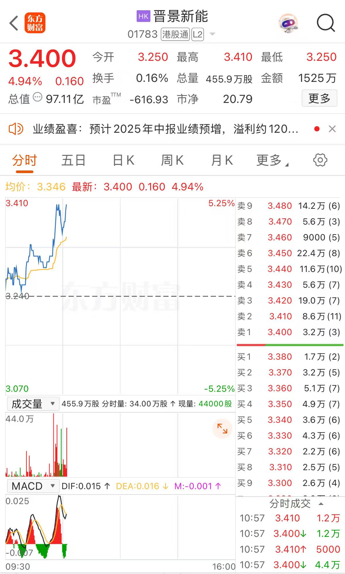 上证报中国证券网讯(记者 刘逸鹏)11月19日早盘,晋景新能股价震荡拉升,一度涨超5%,报3.41港元/股。截至10时57分,该股涨4.94%,报3.40港元/股。