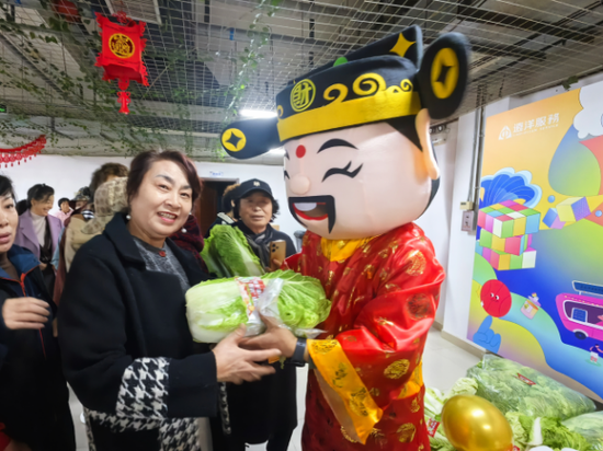 “财神爷”为邻里们送上寓意“百财”的白菜。“百财送万家,邻里常相爱”的祝福语让现场温情满满。