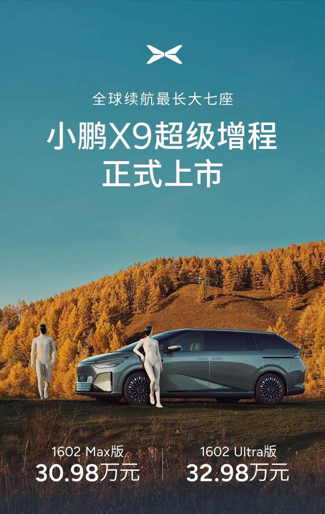 昨天,小鹏 X9 超级增程车型已于正式上市,定位豪华七座 SUV,Max 版起售价为 30.98 万元,Ultra 顶配版本价格为 32.98 万元。