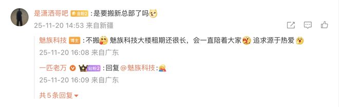 对此,有网友询问魅族科技官微:要搬新总部吗?魅族方面则回复称:「魅族科技大楼租期还很长,会一直陪着大家,追求源于热爱。」
