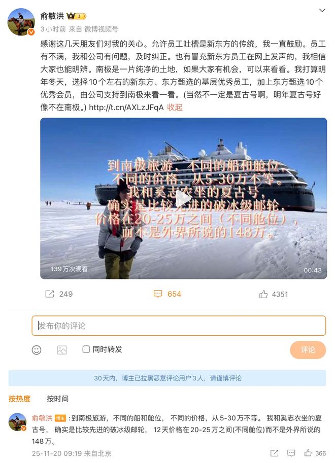 昨天,新东方创始人俞敏洪再发多条南极视频,并发文回应其南极旅行引发的舆论争议。