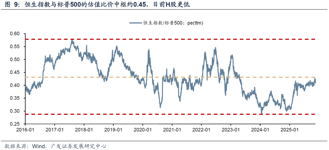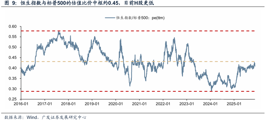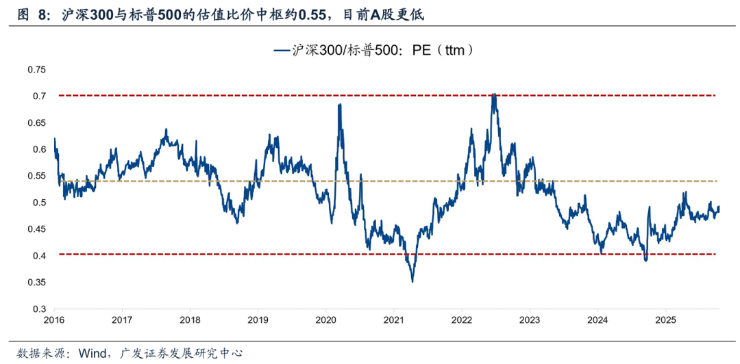 其次,从中美估值对比来看,A股港股目前也较美股估值更有吸引力:沪深300和标普500的估值比中枢大约在0.5,恒生指数和标普500的估值比中枢大约在0.45,考虑今年中美竞争力的边际变化,如果排除中期选举前美股暴跌的可能,那么当前A股估值明显低估,也谈不上泡沫化的风险。