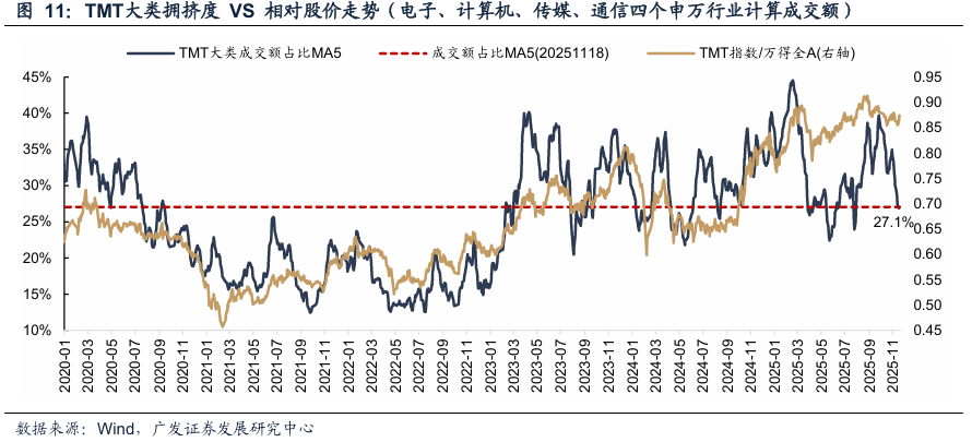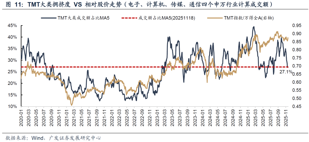 TMT行业成交额占比下降至27%,已经是最近一年20%分位数。本轮TMT成交占比的顶部接近45%,历史来看,情绪高点的成交占比乘以0.6-0.7即为情绪低点,目前已经达到。