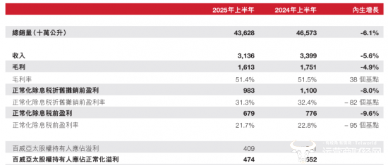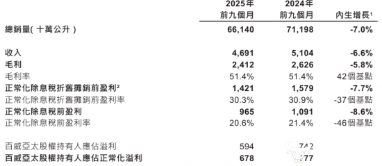 据百威亚太2025年三季度财报,公司营业收入为46.91亿美元,同比下降8.09%,净利润为5.94亿美元,同比下降19.95%,销量为661.40万千升,同比减少7.10%。