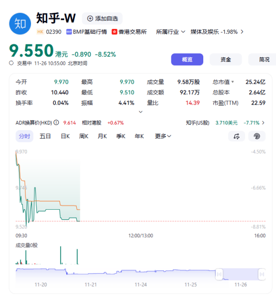 上证报中国证券网讯(李子健 记者 周亮)11月26日,知乎-W低开低走。截至10:55,公司股价报9.55港元,跌8.52%。