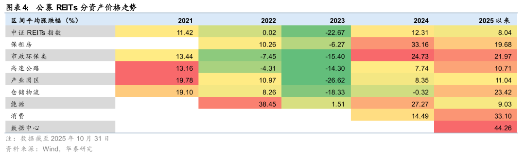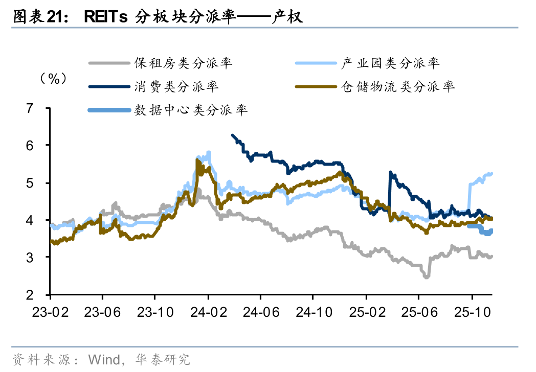 2025年以来,在低利率环境与固收资金欠配的背景下,REITs各板块分派率轮动压降。同年,数据中心REITs作为新资产亮相,市场往往给予“首单”或新型资产一定估值溢价,后续仍可重点关注“首单”、“新类型”概念,该类资产有望贡献超额收益。