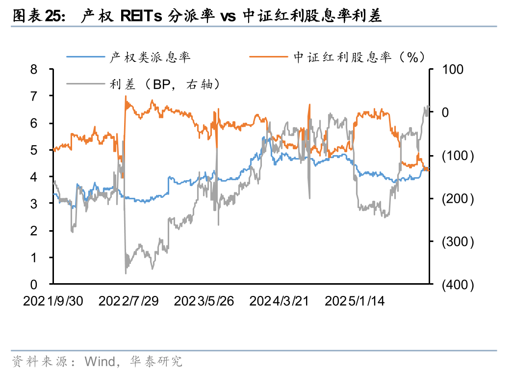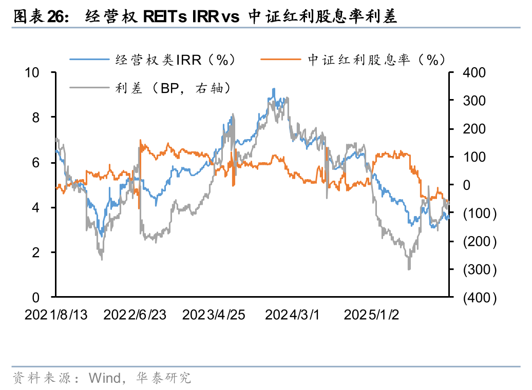 当前产权REITs分派率和红利股息率基本持平,相对于股市高分红属性并不明显,甚至今年年初以来,该利差一度为负,随着REITs估值回调和权益市场风险偏好的提升,二者利差逐渐收窄。但仍有部分权益资金参与REITs市场,主要看重REITs市场的赚钱效应,但经过24、25年两年的上涨,当前REITs估值已经处于偏高位置,在后续基本面波动中有分化、部分资产边际回暖可能性不高、债市或承压的背景下,REITs对权益资金的吸引力可能下滑。