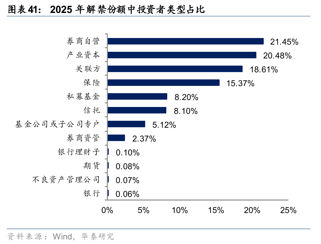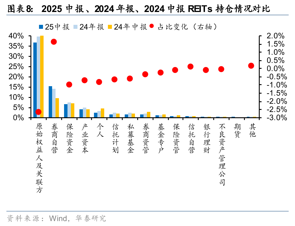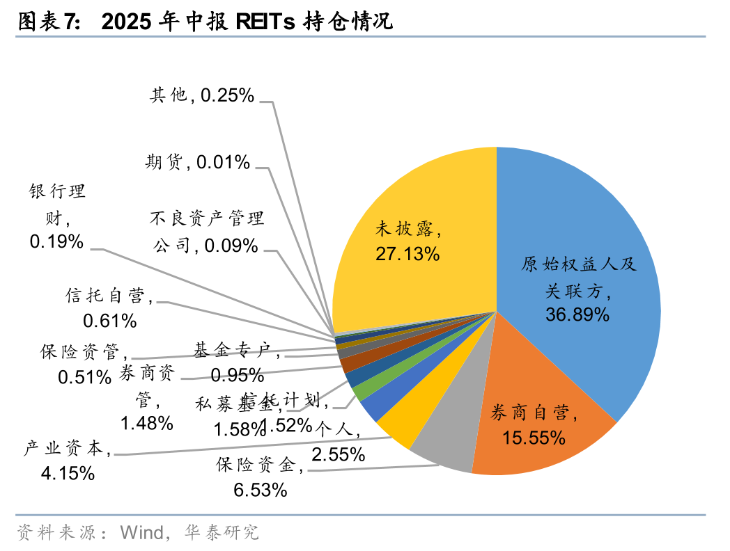 券商自营和保险资金是机构配置的绝对主力。据25年基金中报,机构投资者占比创历史新高,达97.21%,连续两年保持增长,个人投资者占比则降至2.79%。从披露的前十大机构持有人数据来看,原始权益人及关联方的配置仍占据最大比重,占总市值的36.89%;其次,券商自营作为机构配置的核心力量,占比15.55%;保险资金和产业资本次之,分别占比6.53%和4.15%;其余各类机构配置比例均低于2%,私募基金、信托计划、券商资管配置比例均在1.5%左右;基金专户、信托自营、保险资管再次之,占比0.5%-1%之间,其余还有少量银行理财、不良资产管理公司和期货。