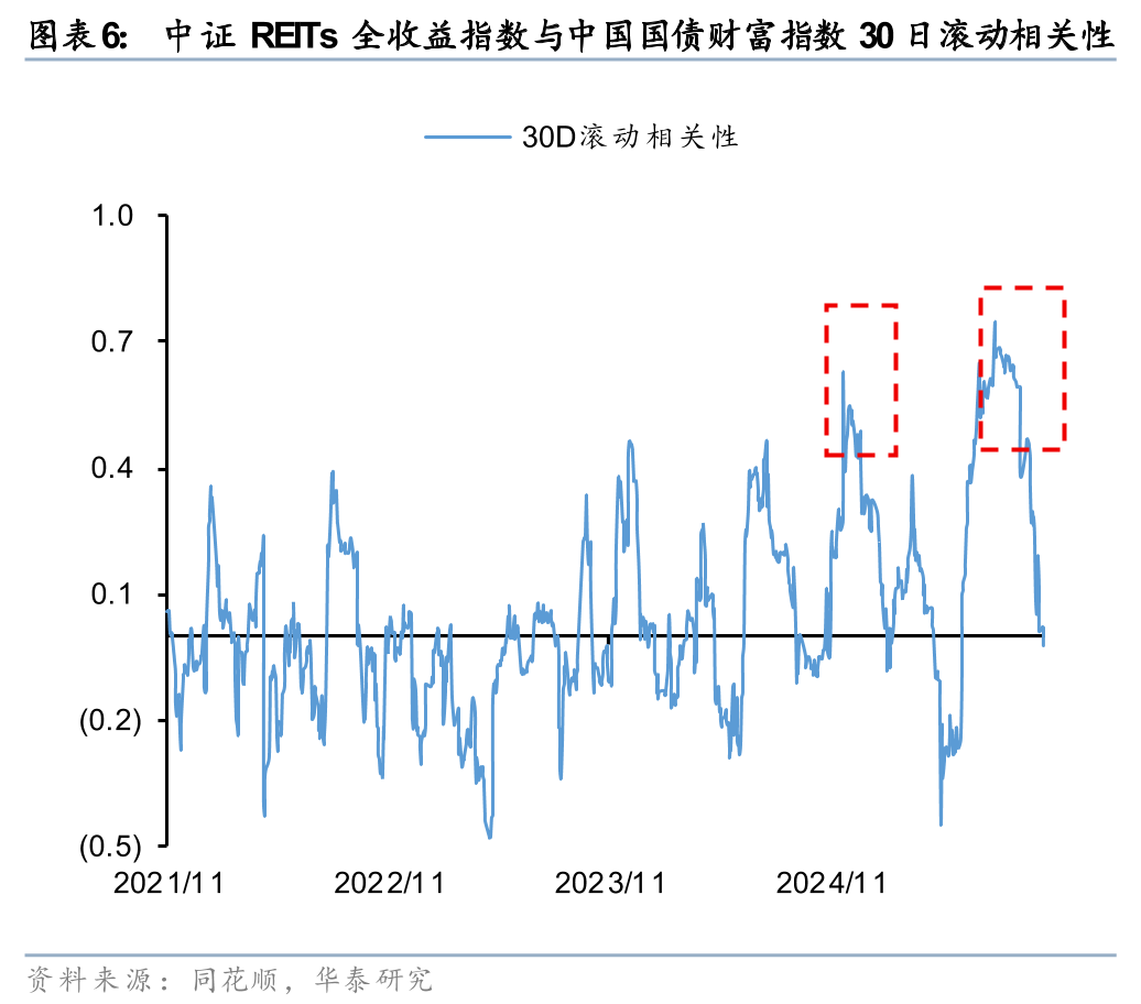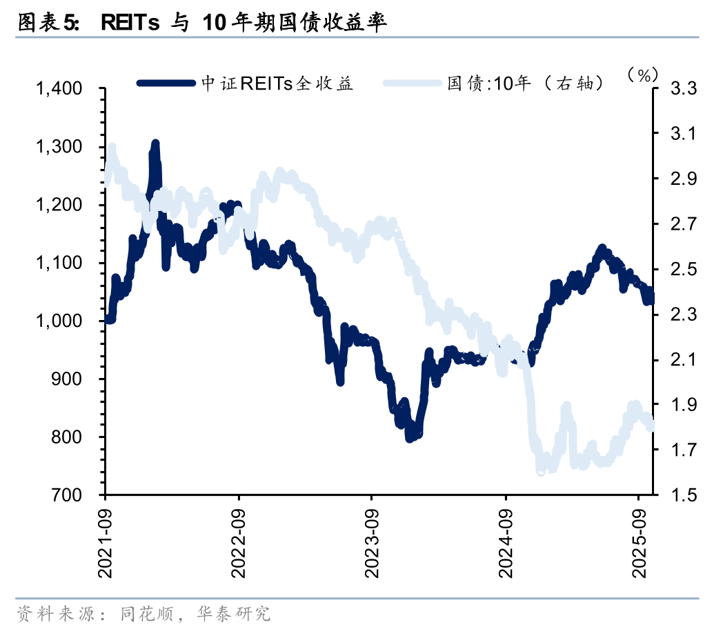 2024年底,更加积极的财政政策与适度宽松的货币政策为利率下行打开空间,REITs相对债券的配置价值凸显,估值随之抬升。今年上半年,在低利率与资金欠配逻辑推动下,REITs与债市走势出现阶段性背离;进入下半年,两者相关性显著增强。与此同时,REITs市场亦与债市同样面临股市的资金分流压力,叠加基本面偏弱及上半年累计涨幅较高,机构兑现收益的意愿明显上升。