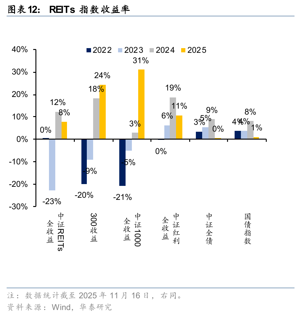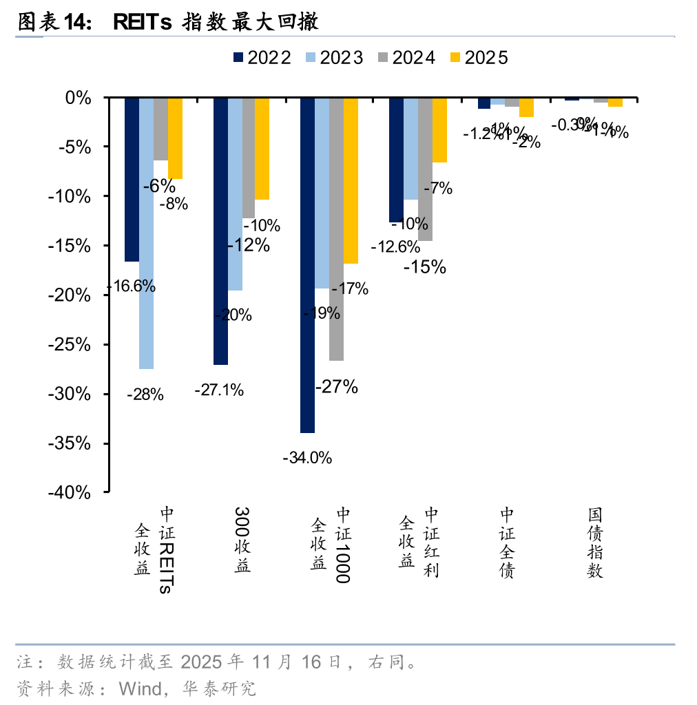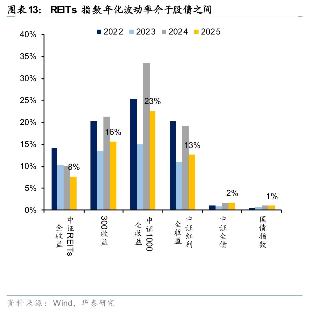 REITs波动率始终介于股债之间,今年以来公募REITs价格表现不及股票,但好于债券,最大回撤未超过8%,2022年REITs市场年化收益率为0%,最大回撤为-16.6%,跑赢300收益与中证1000全收益,不及中证红利全收益与债市,年化波动率为14.05%,介于股债之间。2023年REITs市场年化收益率为-22.67%,最大回撤为-27.69%,表现不及股债,年化波动率为10.30%,介于股债之间。2024年REITs最大回撤和波动率表现均优于股票,收益率介于股债之间。2025年REITs收益率为7.80%,最大回撤为-8.30%,表现不及债券、红利,但优于大盘和中小盘股票,年化波动率为7.7%。