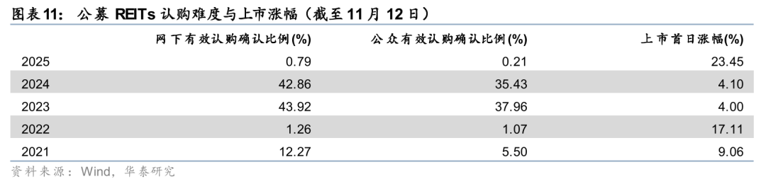 我们在2025年8月26日发布的《2025公募REITs一级发行的八个特征》写到:今年一级市场呈现出供给放缓、资产丰富、认购比例低、上市涨幅高、战配难获取、网下无限售、监管估值压降幅度收窄、询价区间上限打开八个特征。近期一级市场打新情绪由热转冷,随着二级价格回调,市场热度有所降温。