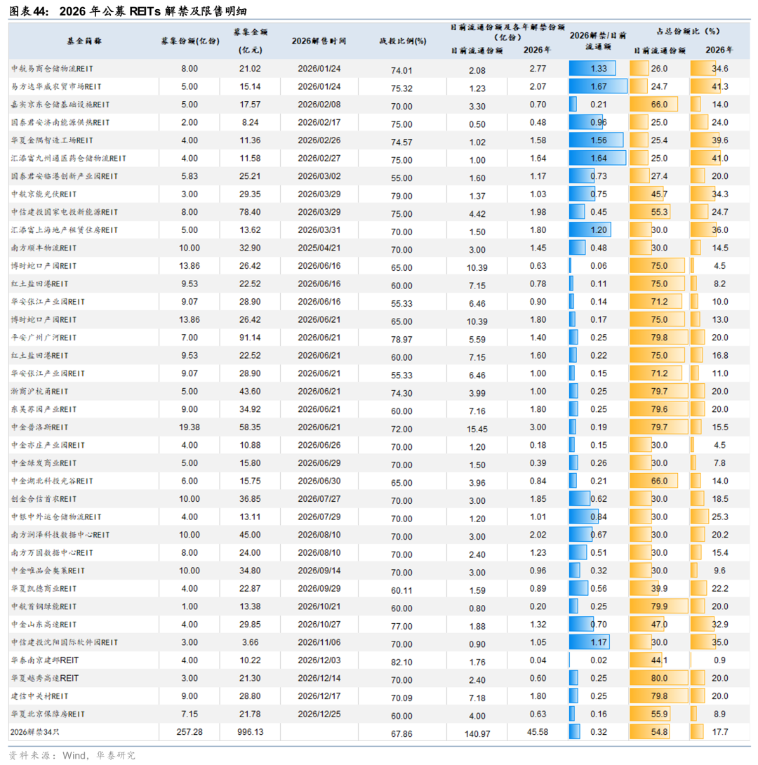 解禁实际抛售压力与解禁份额、REITs前期累积收益、机构诉求、市场行情相关。部分产品解禁份额超过解禁前流通份额,需关注解禁带来的供给和价格冲击。2026年,中航易商仓储物流REIT、易方达华威农贸市场REIT、华夏金隅智造工场REIT、汇添富九州通医药仓储物流REIT、汇添富上海地产租赁住房REIT和中信建投沈阳国际软件园REIT共计6只REITs的解禁份额大于目前流通份额,占比在117%~167%之间,剩余REITs的解禁份额均小于目前流通份额,占比在2%~96%之间。项目累积涨幅越高、投资者兑现收益的动力越强,如22年首批解禁的能源环保类;反之市场情绪越低迷,解禁前流通盘的抛售压力越大,如23年4月、12月解禁前的大跌。市场调整后,解禁也可能带来新的配置机会,可通过大宗交易等形式增配优质项目。