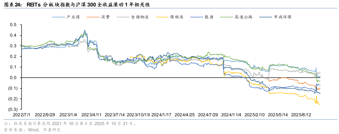 截至2025年11月16日,按照2024Q4-2025Q3分派率TTM计算,产权REITs平均分派率为4.00%,经营权平均分派率7.77%,与1.75%的10年期国债收益率利差分别2.25%和6.02%,分底层资产来看,保租房、产业园、仓储物流、消费、数据中心、市政环保、能源、高速分派率分别为2.97%、4.53%、4.10%、3.84%、3.00%、5.99%、7.19%、8.68%。低利率环境下,公募REITs作为较高分红、风险适中、与其他各类资产相关性均较低的资产,短期可能面临一定调整压力,年底机构赎回兑现收益、解禁项目增加带来抛售压力等因素均较为不利,但中长期来看仍具备长期配置价值。