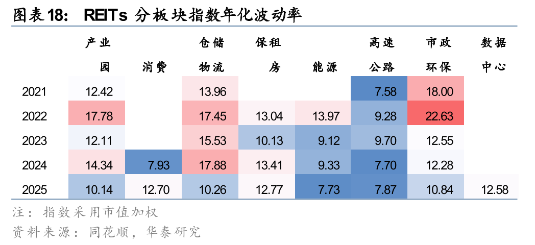 不同类别REITs的基本面与价格走势分化显著,板块内多呈现同涨同跌特征。从历史表现来看,挖掘板块β的收益优于个体α。具体来看,2022年以来,REITs市场整体呈现弱修复态势,其中抗周期属性较强的稳健型资产表现突出,如保租房、能源与市政环保类REITs,在其他资产上涨时涨幅较高,而在市场回调时亦展现出良好的抗跌属性。相比之下,与经济周期关联度较高的仓储物流、产业园及高速公路类REITs,受基本面波动影响更为直接,价格起伏也更为明显。