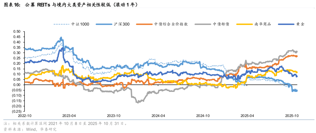 公募REITs近年与债市的相关性明显提升,与股市的相关性下降。计算公募REITs指数其他大类资产的1年滚动相关性,其与权益、债券、商品及黄金等主要大类资产之间相关性普遍较低,相关系数多在0.3以下。历史来看21、22年REITs和股票的相关性较高,但近年与股市的正相关性逐步下降,而与债券指数的正相关性提升,债性表现增强。未来伴随REITs市场持续扩容与估值体系逐步成熟,其在资产配置中作为低相关性资产的价值或将进一步凸显,有助于提升整体组合的风险分散效果。