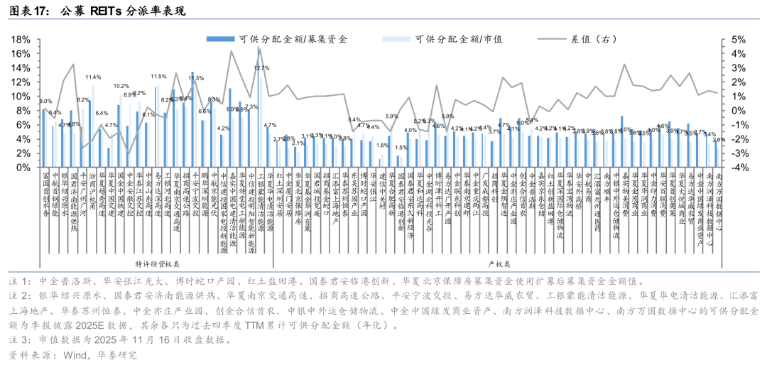 当前时点应该如何操作,截至2025年11月16日,P/NAV处于历史69%分位数,整体估值水平相对偏高。我们认为基于基本面层面的分化,二级市场价格的分化也是必然,不同底层资产应采取不同的投资策略。对于基本面相对稳健的项目,可以进行长期配置,如保租房、消费、市政环保类,关注其配置锚,其分派率与10年期国债之间的利差是可参考的定价基准,调整后带来配置机会,反弹或将率先从这几个板块开始。