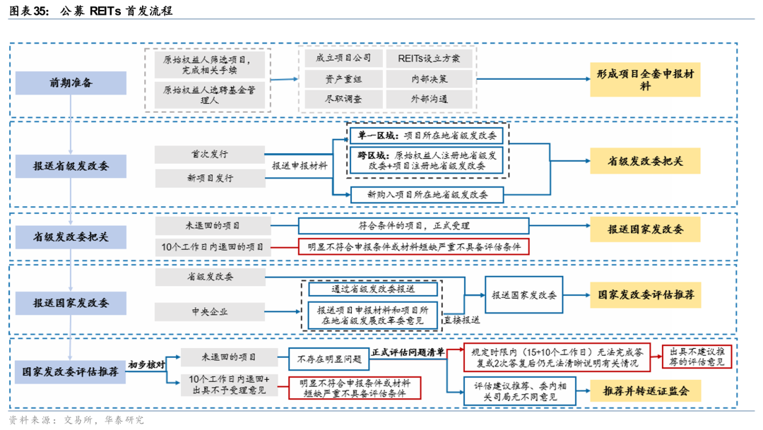 从REITs发行审核流程来看,需要经过地方发改委-国家发改委-证监会、交易所几个监管主体,预计发行数量上将稳步提升。在当前的REITs发行审核流程中,地方发改委连同发行人(项目原始权益人)筛选优质项目纳入全国基础设施REITs试点项目库,入库后发行人需向项目所在地的省级发改委报送申报材料。省级发改委进行初步审核,推荐至国家发改委,而后国家发改委综合评估,确定拟向证监会推荐的项目名单。经国家发改委出具项目推荐函后,证监会、沪深交易所等机构将依照相关规定,就基金注册、上市与ABS挂牌等事宜做出决定。