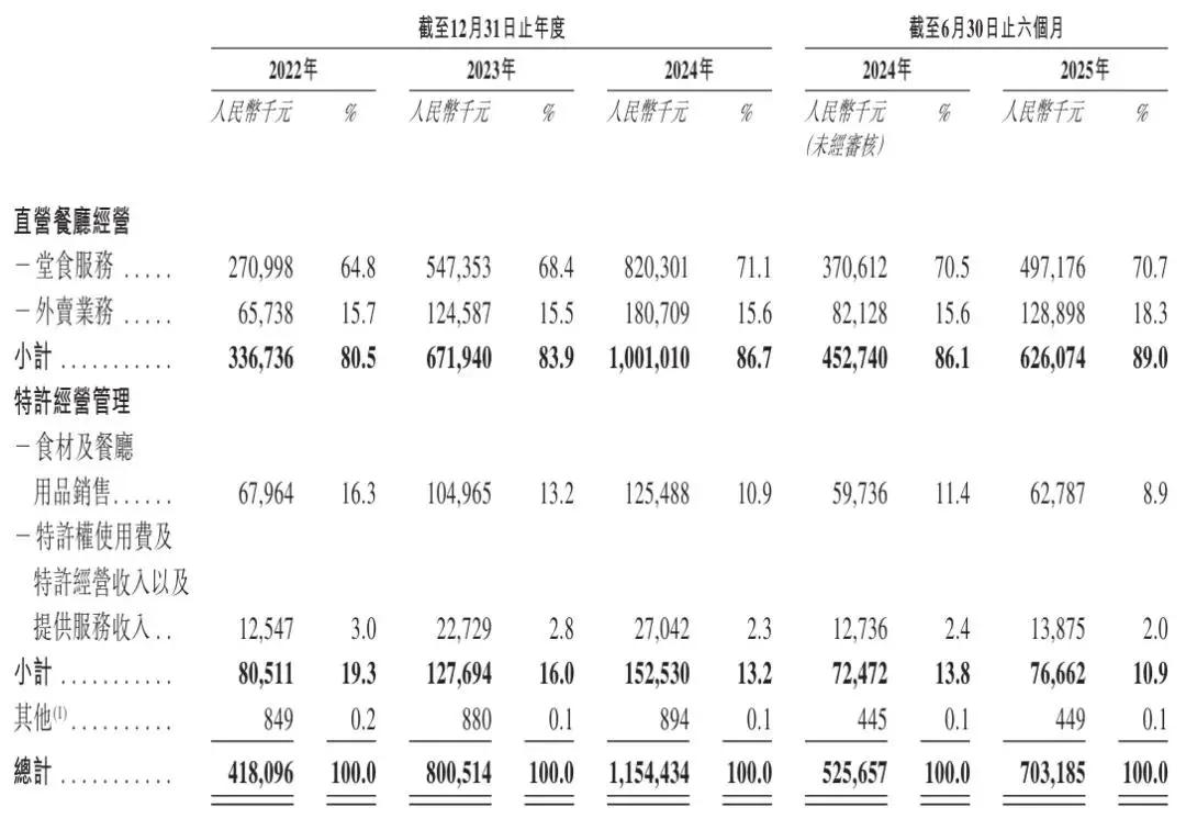 遇见小面2025年上半年来自直营餐厅经营收入为6.26亿元,占比为89%;来自特许经营管理收入为7666万元,占比为10.9%。