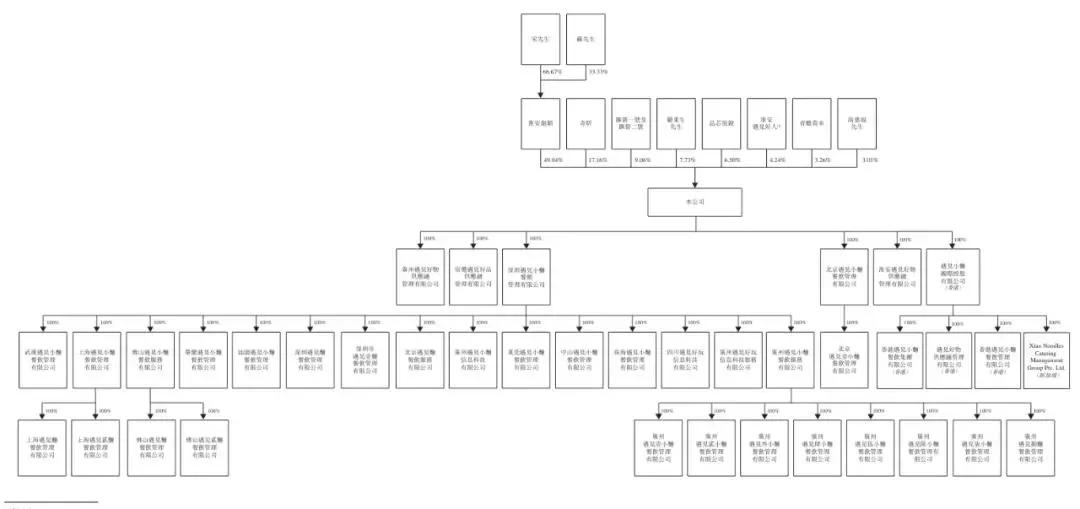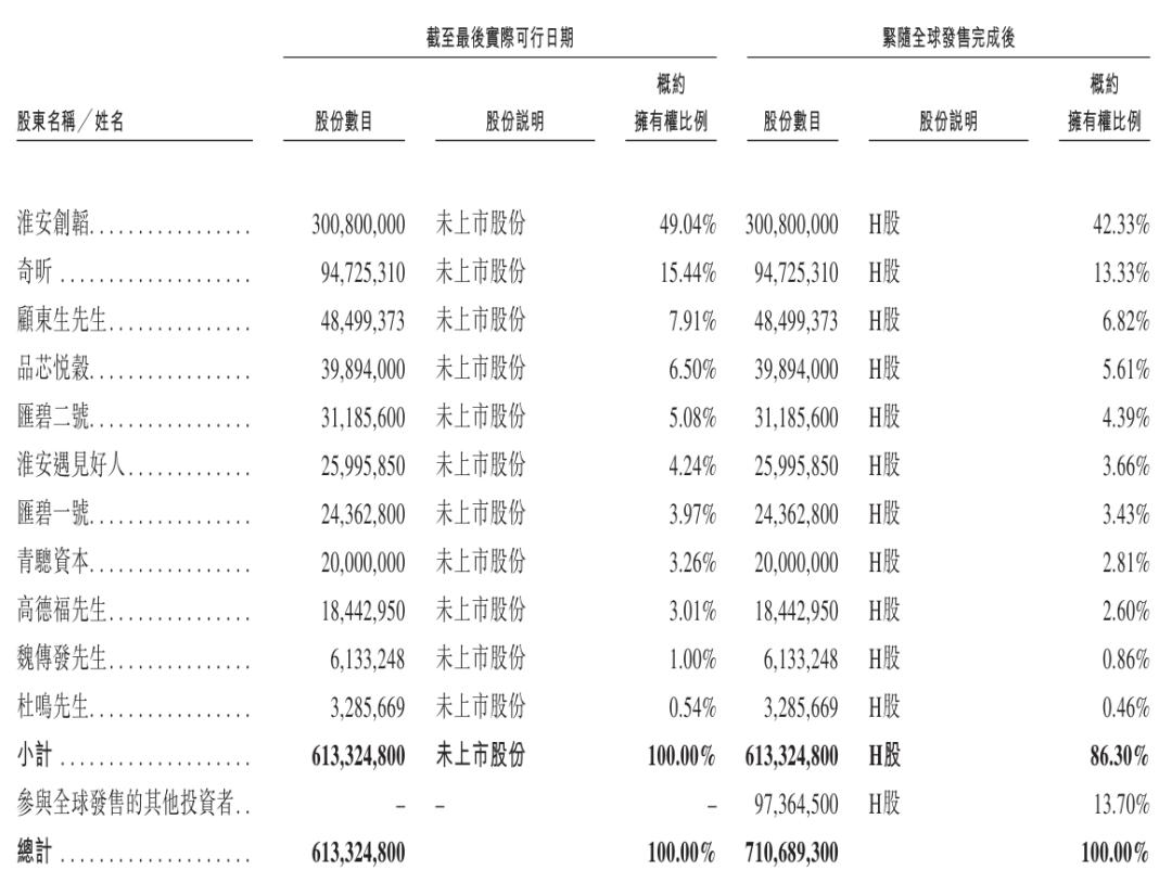 IPO后,淮安创韬持股为42.33%,弘毅投资通过百福控股旗下奇昕持股为13.33%,顾东生持股为6.82%,九毛九旗下品芯悦谷持股为5.61%,汇碧二号持股为4.39%;