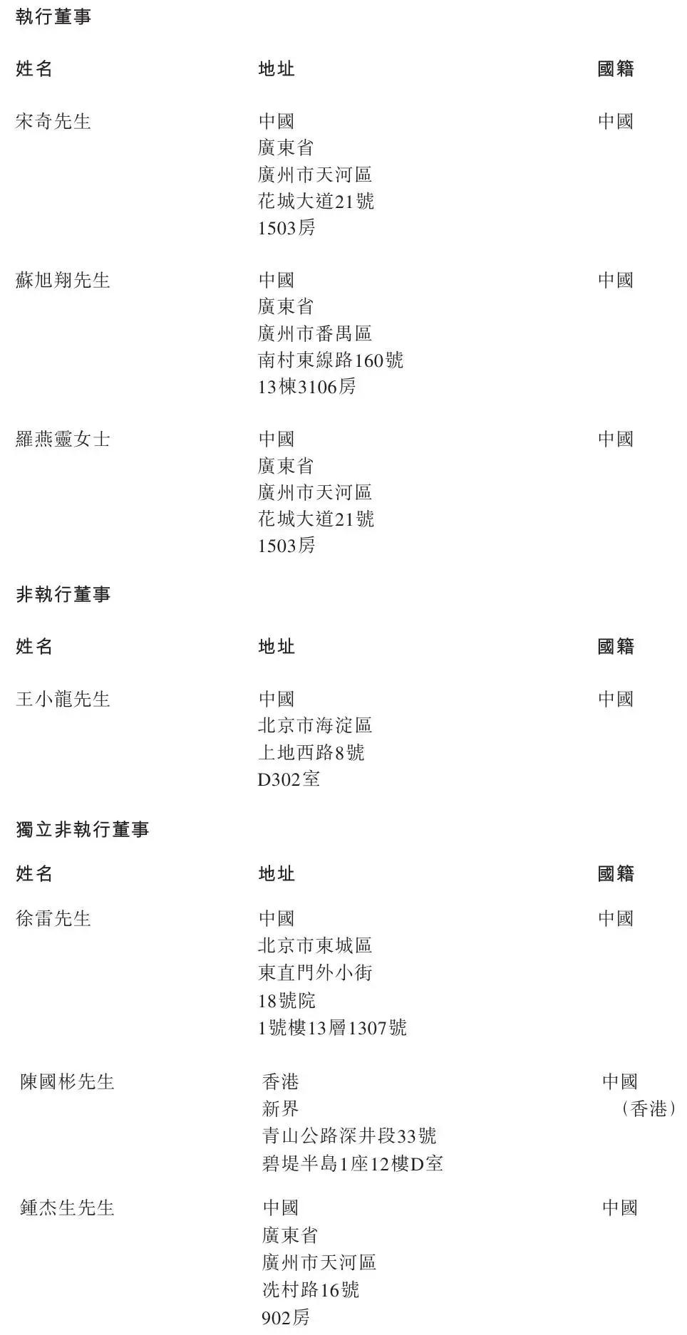 遇见小面执行董事分别为宋奇、苏旭翔、罗燕灵女士;非执行董事为王小龙;独立非执行董事分别为徐雷、陈国彬、钟杰生。