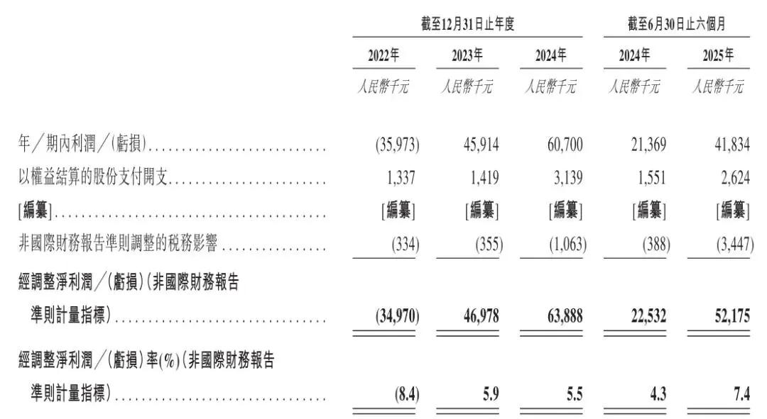 遇见小面2022年、2023年、2024年经调整净利分别为-3497万元、4698万元、6389万元;经调整净利率分别为-8.4%、5.9%、5.5%。2025年上半年经调整净利为5218万元,经调整净利为7.4%。