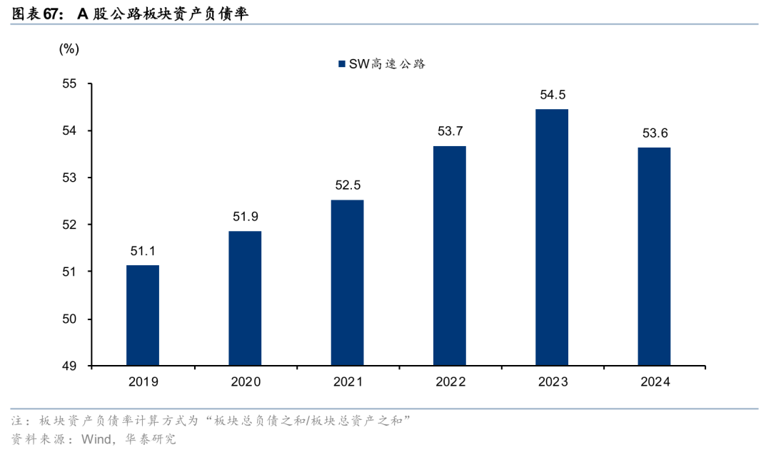 与改扩建不同,收购公路项目通常能直接增厚盈利,但对资产负债率的空间有要求。随着行业进入改扩建高峰期,公路板块的平均资产负债率已从2019年的51%攀升至2024年的54%。对于公路国央企,资产负债率考核通常要求“控制在65%以内”。未来,行业资产负债表问题或更为突出,资本市场融资需求或随之显现。