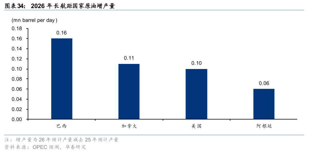 根据OPEC最新预测,2026年非OPEC+国石油产量预计为5,475万桶/天,较25年增加63万桶/天。其中,主要增量来自于长航距美洲国家,如巴西/加拿大/美国/阿根廷预计增量为16万/11万/10万/6万桶/天。