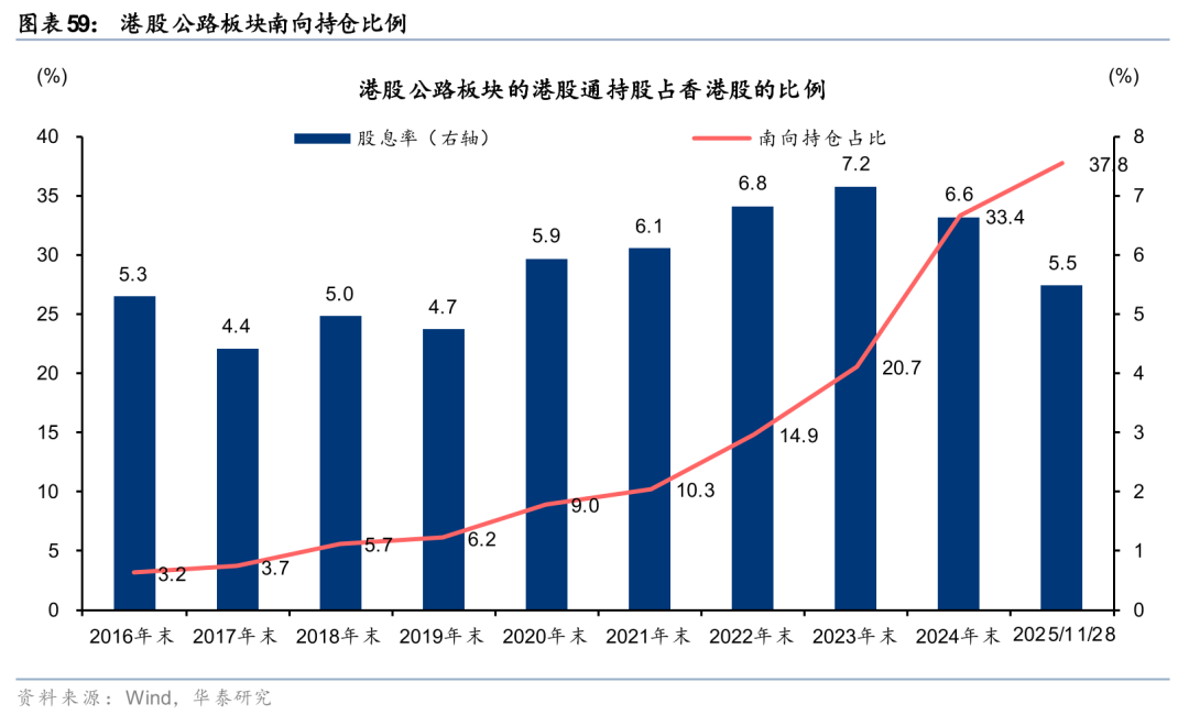港股公路整体回报优于A股,主因海外降息、“资产荒”驱动南向资金增配以及港股流动性折价修复。2025年初至11月28日,美国10年期国债收益率从4.58%震荡下降至4.02%。中国新经济亮点突出,明星股票IPO、港股低估值、人民币走强均吸引内外资流入,带动恒生指数(全收益)上涨28.9%,港股流动性折价获得修复。2025年初以来,12个月期Hibor从4.2%降低至11月28日的3.2%,为港股红利估值提供支撑。此外,内资配置盘加仓也是港股公路上涨的重要因素,港股公路板块南向持仓比例已从年初的33.4%上升至37.7%。截至11月28日,港股公路板块的2024年股息率为5.5%,仍显著高于疫情前2016-2019年均值(4.9%),估值仍有吸引力。