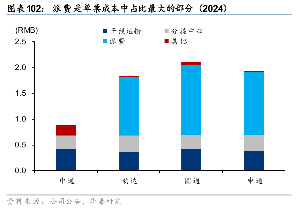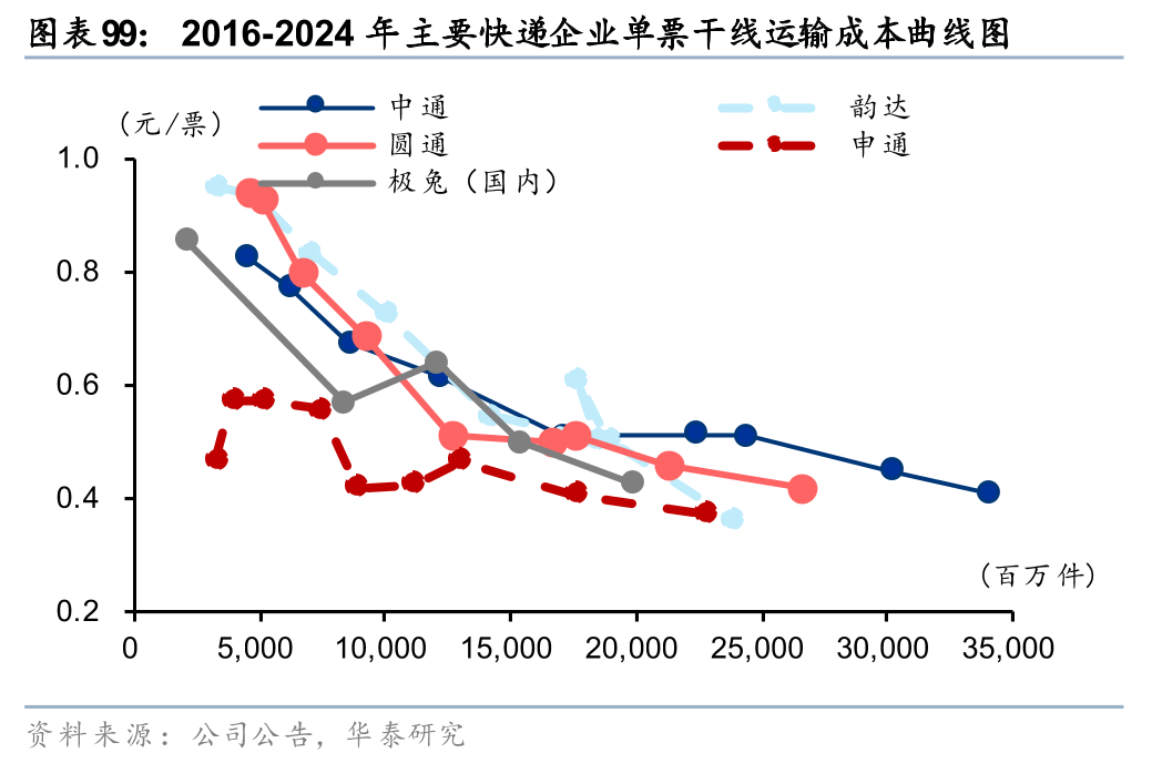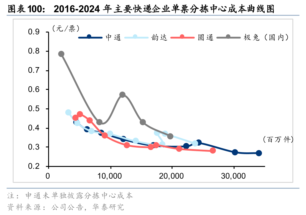 总部主要成本为干线运输、分拨中心、派费(支付给派件加盟商)三部分。自2003年韵达在全行业率先建立分拨中心、2005年中通在全行业率先开行省际班车以来,加盟制快递总部降本核心为分拨和干线环节:1)分拨:集中操作,自动化替代人工;2)干线运输:路由优化、精细化管理、车队直营化、车辆装载率和利用率提升。时至今日,干线运输和分拨环节剩余成本节降空间相对有限,规模效应或已接近极限,而占总成本超过50%的末端揽派是下一步降本的重点。我们看好末端无人化推进优化快递成本,带来全链路利益重分配与行业格局演变,中长期解放快递员时间,进而在末端提供高品质差异化服务,推动行业第三轮格局演变。