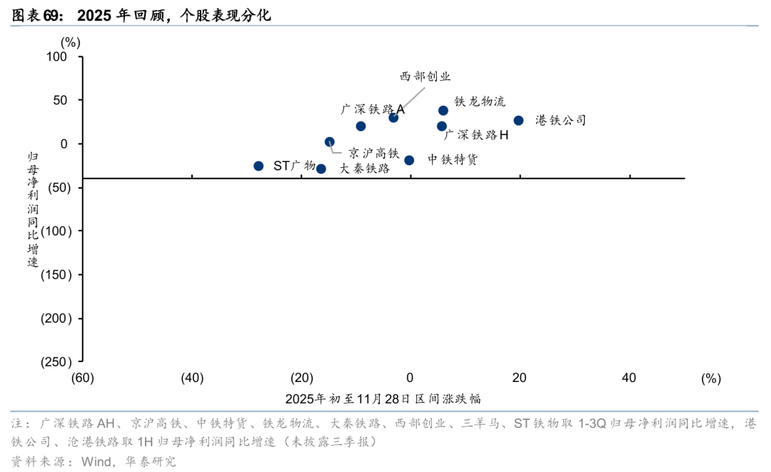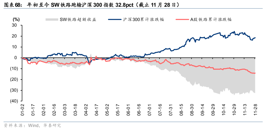 A股铁路板块的整体表现弱于大盘。2025年初至11月28日,SW铁路指数下跌约14.3%,跑输沪深300指数约33个百分点,主因:市场风险偏好上行,稳健型资产吸引力下降;铁路板块整体盈利景气度转弱。
