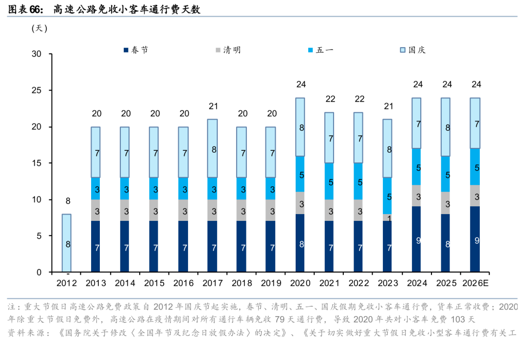 26年免费天数预计持平25年。2024年高速公路对小客车免费天数同比增加3天至24天,对公路板块盈利有小幅拖累。根据《国务院关于修改〈全国年节及纪念日放假办法〉的决定》以及交通部《关于切实做好重大节假日免收小型客车通行费有关工作的通知》,我们预计2026年高速公路对小客车免费天数或仍为24天(同比持平)。