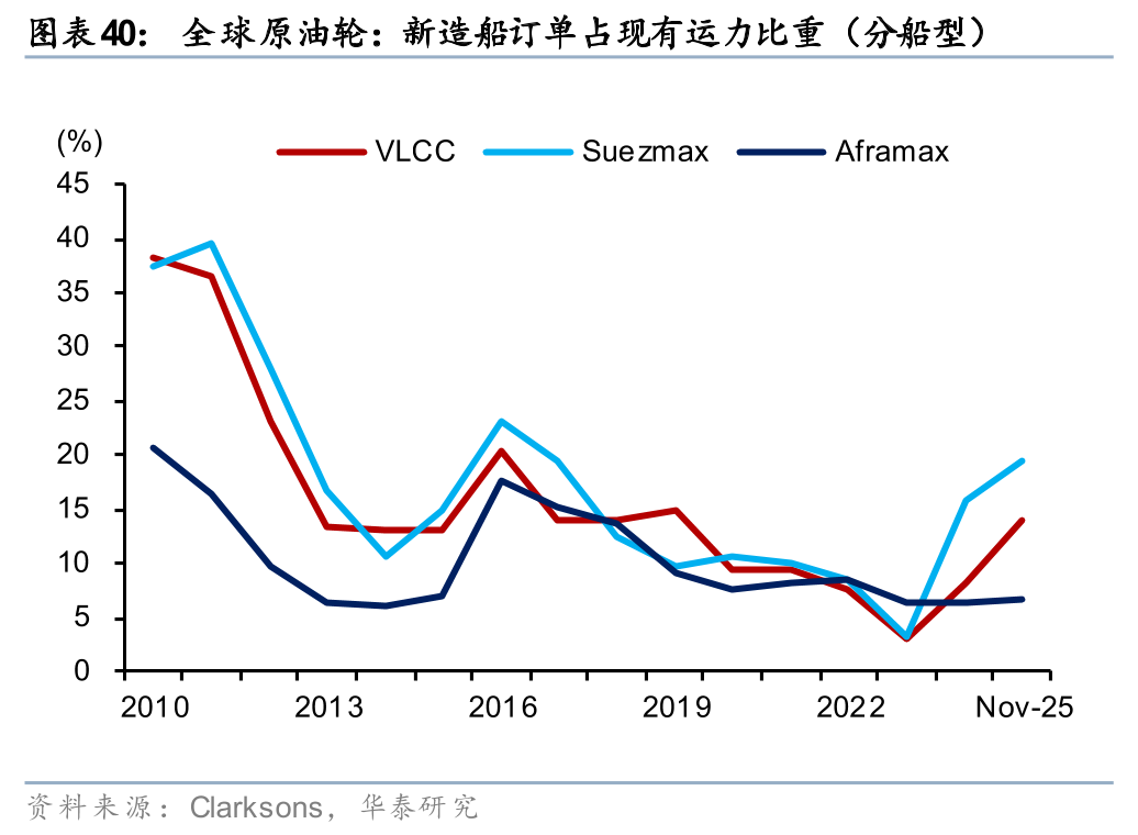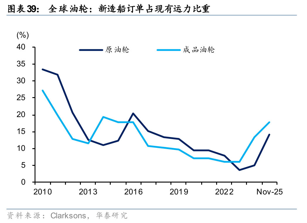 26年原油轮及成品油轮新造船供给或有所增加。截至11月28日,全球原油轮(VLCC+Suezmax+Aframax)新造船订单占现有运力比重为14.1%(上年同期5.1%)。其中VLCC/Suezmax/Aframax船型新造船订单占现有运力比重为14.1%/19.6%/6.6%(上年同期8.3%/16.0%/6.4%)。成品油轮(LR+MR+Handy)新造船订单占现有运力比重为17.4%(上年同期13.3%)。