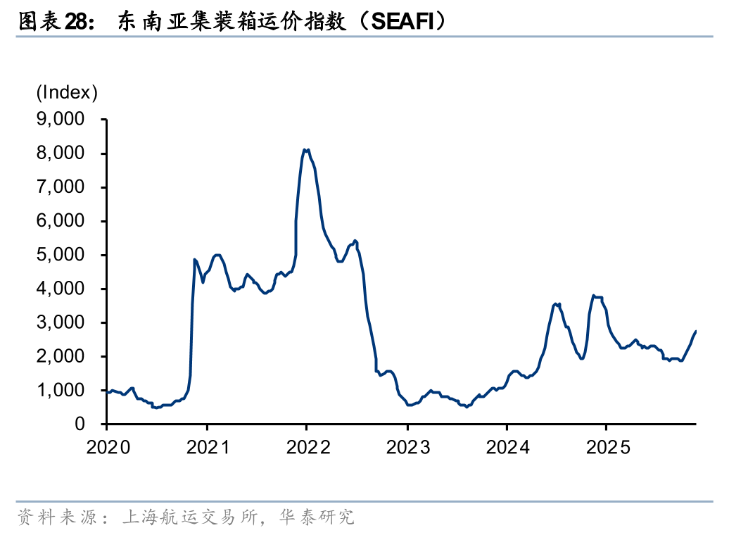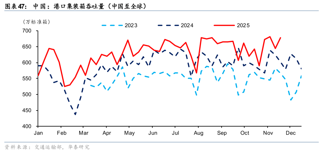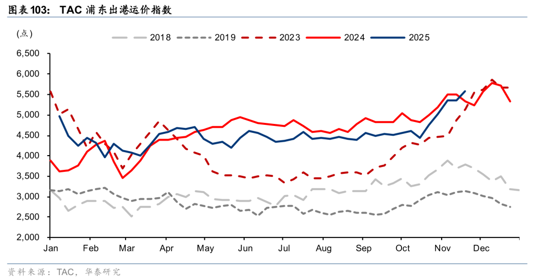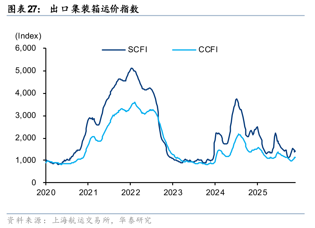 2) 集运:25年市场受中美关税反复扰动。4月美国对中国加征关税,货主选择暂停发货,运价同环比大幅下滑;自5月以来,中美加征关税暂缓,出口货量环比回升,推涨运价。下半年以来,伴随出口需求增速边际放缓和加班船运力增加,运价呈现高位回落趋势。