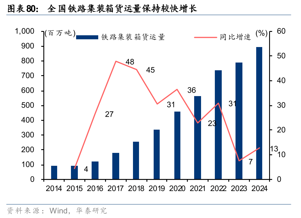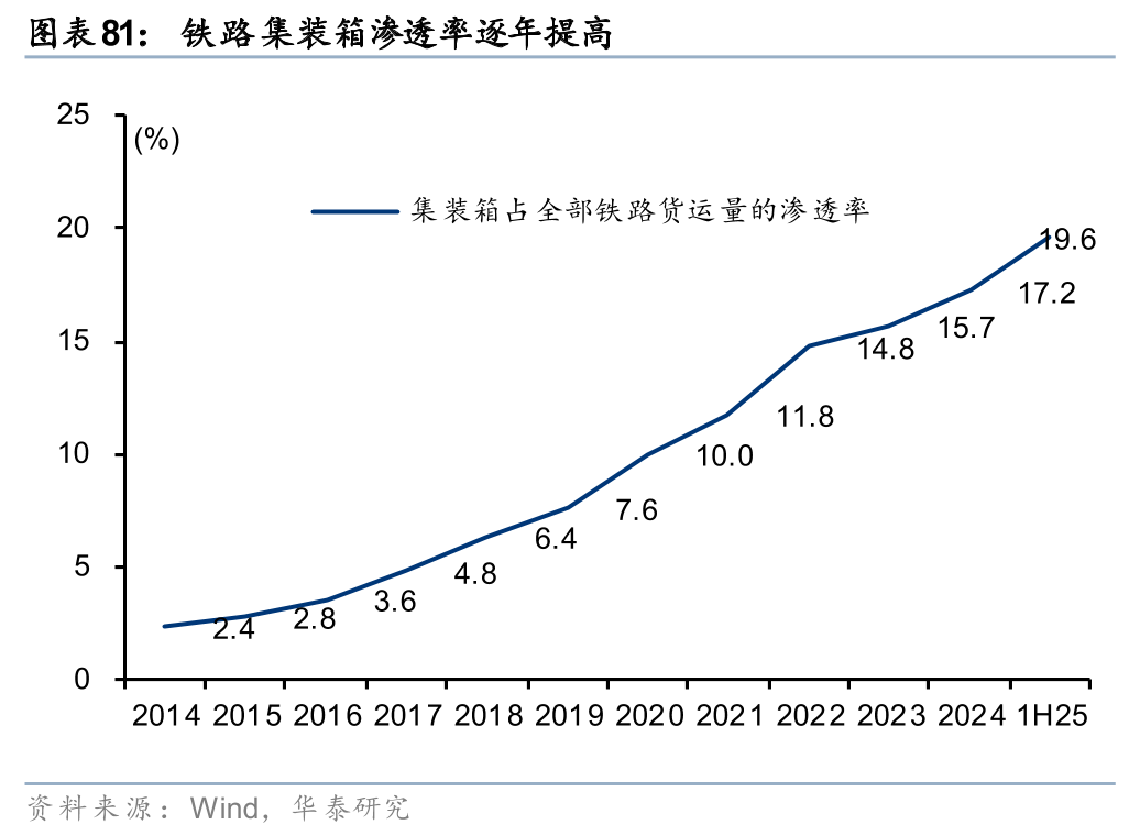 铁路设备持续升级,集装箱渗透率进一步提高。集装箱运输的高效便捷优势突出,随着“散改集”红利释放,全国铁路集装箱占铁路总货运量的渗透率已由19年7.6%快速提高到1H25的19.6%,并且较发达国家的30-40%渗透率水平有进一步提升空间。铁龙物流主营铁路特种集装箱、铁路货运及临港物流、供应链管理业务,1H25业务毛利占比为69.6%/22.5%/6.6%。顺应铁路设备升级趋势,我们认为铁路特种集装箱业务发展前景广阔,既有集装箱对传统敞车的替代,也有适箱货物范围扩大、拓展全程物流的增量。