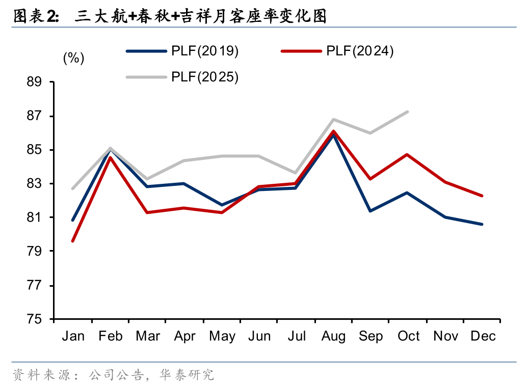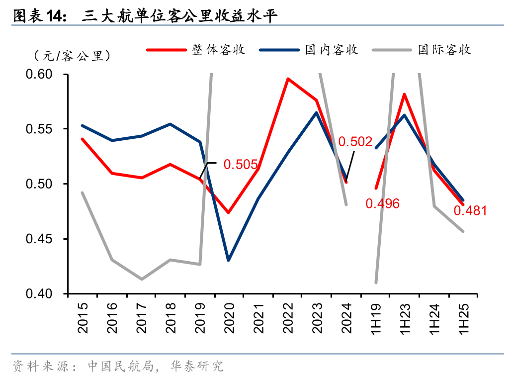 客座率处于较高水平,提升票价或将成为航司收益管理重点。我们认为我国航司在疫后将恢复提高生产量作为首要目标,收益管理更偏向提高客座率,价格竞争较为激烈,使得客座率在疫后持续爬升,但单位客公里收益水平较弱,处于历史底部区间。2025年1-10月,行业客座率为85.1%,同比提升1.7pct。我国民航客座率全年历史高点为83.2%,25年全年超过历史高点的概率较大。单位客公里收益方面,三大航1H25整体相比1H19低3.1%,其中国内线低8.9%。