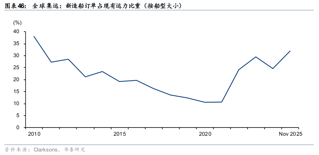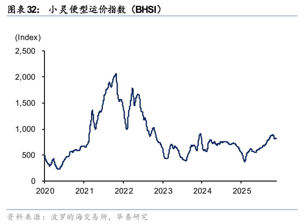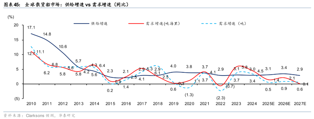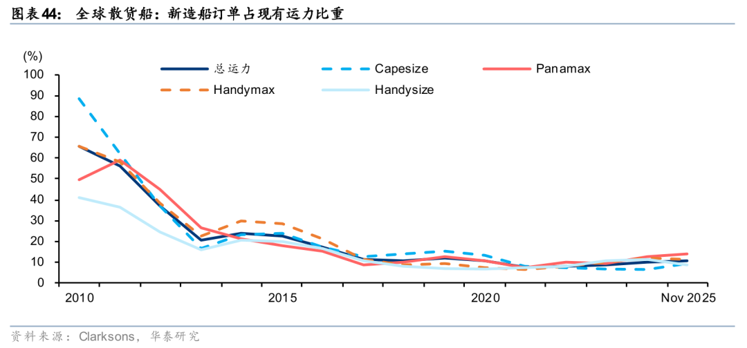 25-27年全球散货船供给温和增长。截至11月28日,全球散货船新造船订单占现有运力比重为10.9%(上年同期9.9%)。其中,Capesize/Panamax/Handymax/Handysize船型订单比重分别为9.3%/14.1%/11.2%/8.9%。整体上看,Clarksons预测25/26/27年全球散货船名义运力同比增长3.1%/3.4%/2.9%。我们认为,尽管26年市场表观运力增长高于需求增长,但即期运价表现仍受地缘事件,商品价格波动,异常天气等不确定性因素影响,或出现短期市场供需错配,推涨运价。