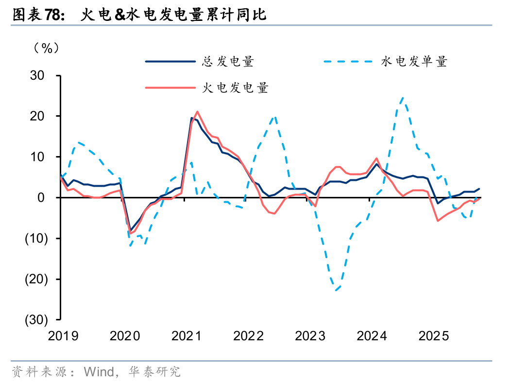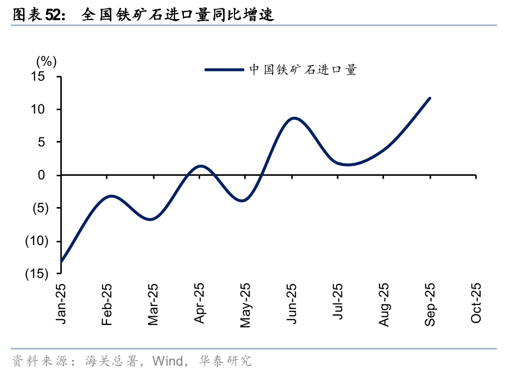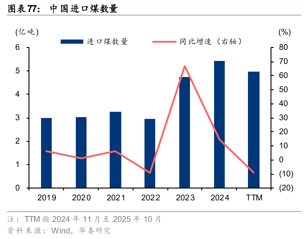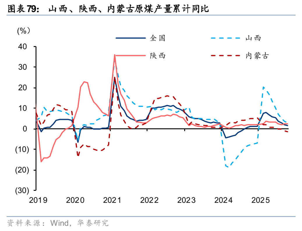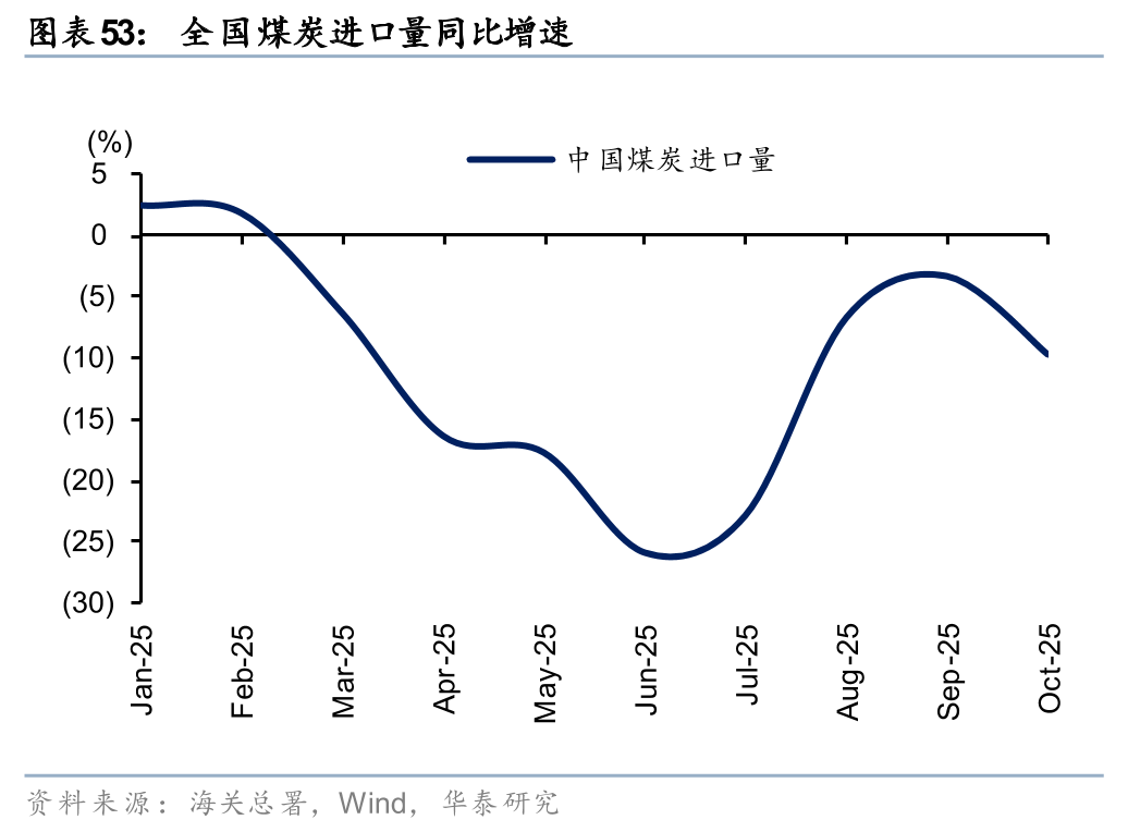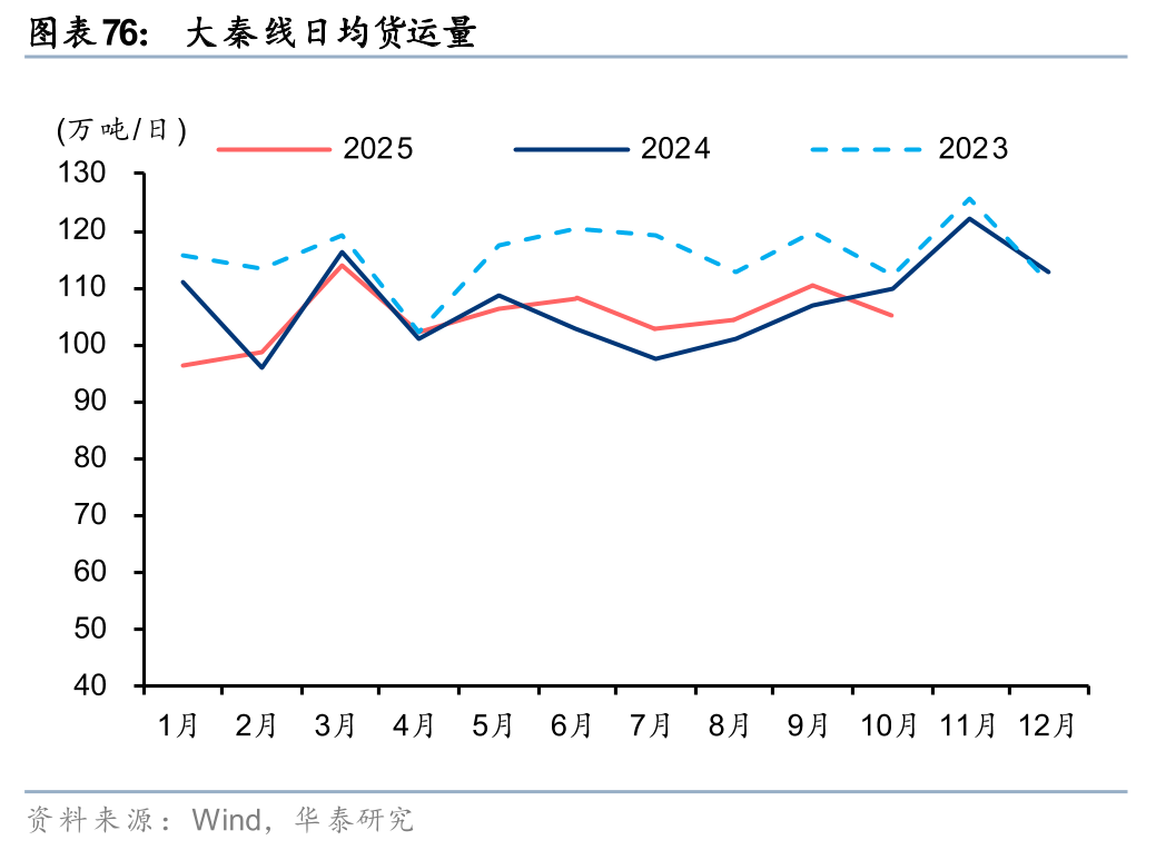 25年1-10月大秦线累计完成货物运输量31,838万吨,同比下降0.7%。1)需求端,电煤需求偏弱。火电同比负增长,风光核等新能源冲击持续加码。2025年1-10月份火电发电量同比下降0.4%,核电、风电、太阳能发电量增幅分别为8.7%/7.6%/23.2%。受地产下行、基建偏弱影响,重点建材产品同比继续减量,主要耗煤行业产品的产量下降,1-10月份粗钢产量同比下降3.9%,水泥产量同比下降6.7%。2)供给端,煤炭产量在去年“安监”的低基数上增长。大秦线主要货源地山西1-10月产量同比增长3.0%。3)竞争方面,因国内煤价较低,进口煤数量下降,对大秦线的竞争趋缓。1-10月进口煤数量同比下降11.0%。神华旗下黄骅港与天津煤码头装船量同比增长2.3%、3.6%,略好于大秦线表现。