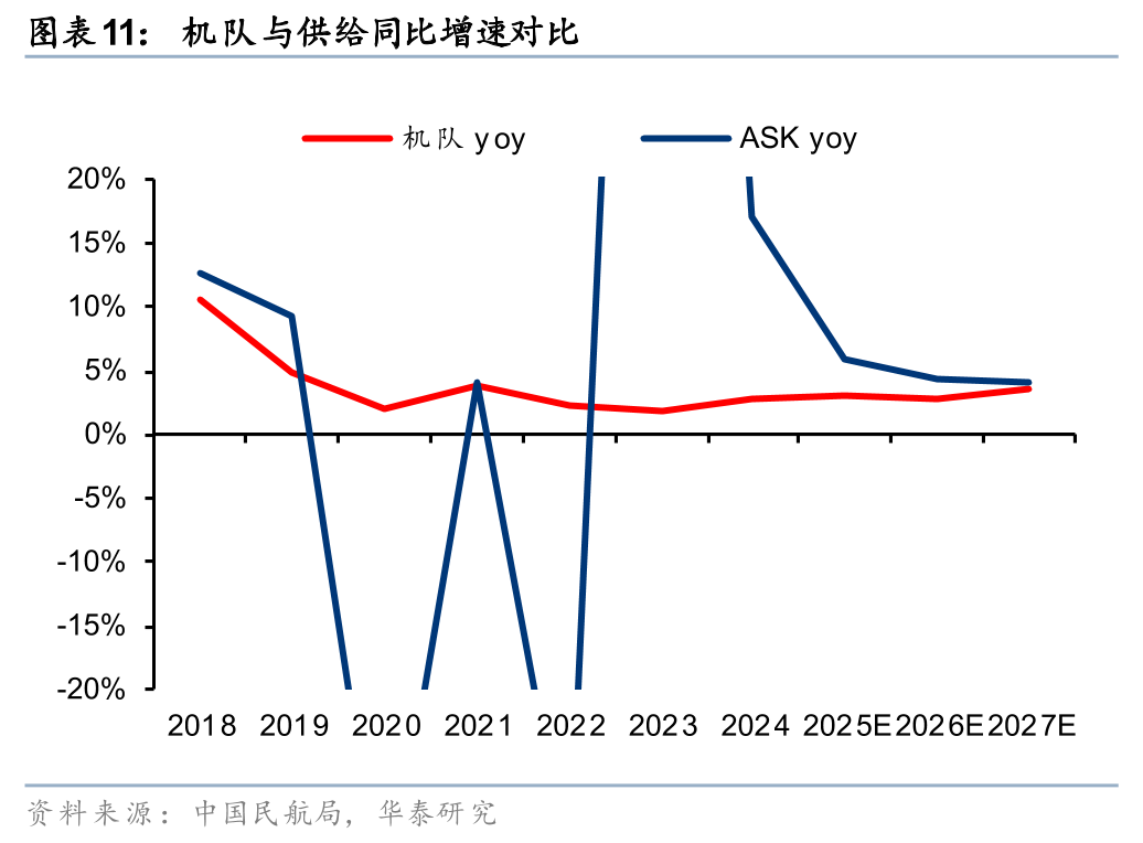 综合考虑利用率和机队增速,预计26E/27E行业供给增速为4.4%/4.2%。25年1-10月行业飞机利用率达到9.2小时,同增2.2%。历史上我国机队利用率高峰约为9.5小时,19年或由于B737MAX停飞,利用率降低至9.3小时。我们认为往后看飞机利用率对于行业供给的贡献将进一步下降。考虑到普惠发动机维修飞机停场仍在影响利用率提升,或将在未来两年逐渐好转,我们假设26E/27E行业飞机利用率为9.30和9.35小时,分别同增1.6%/0.5%,推动供给向静态机队增速靠拢。我们测算26E/27E行业供给增速为4.4%/4.2%,相比25年进一步下降。
