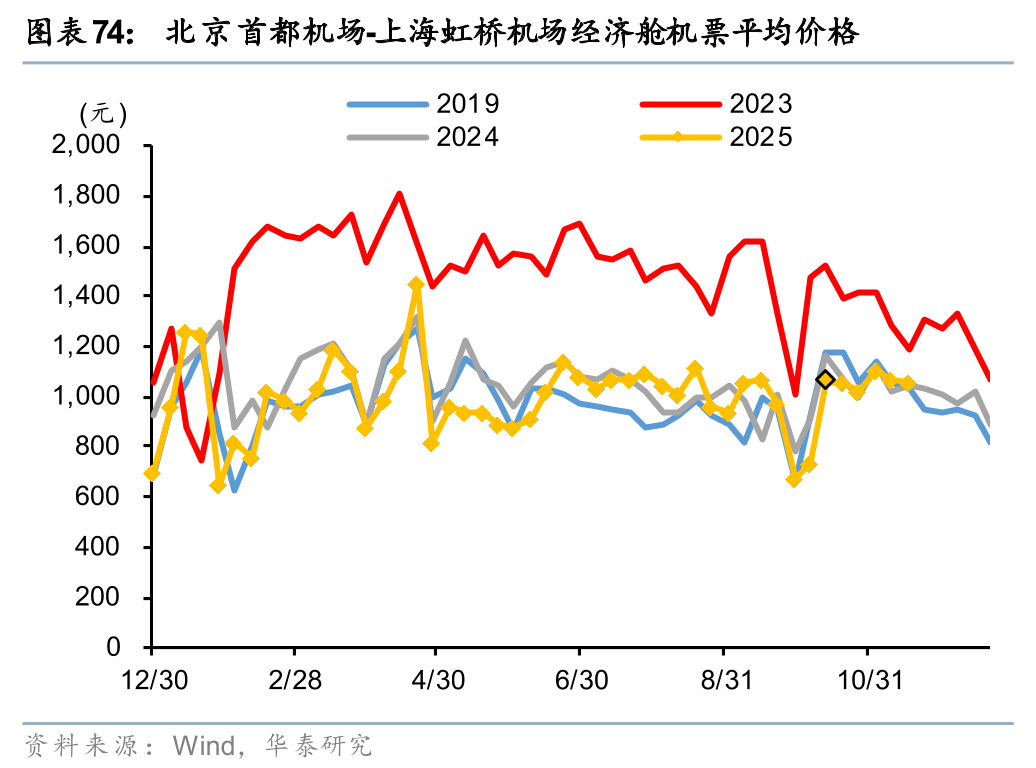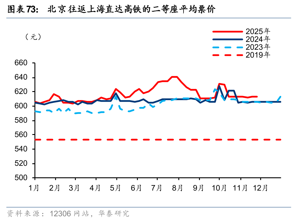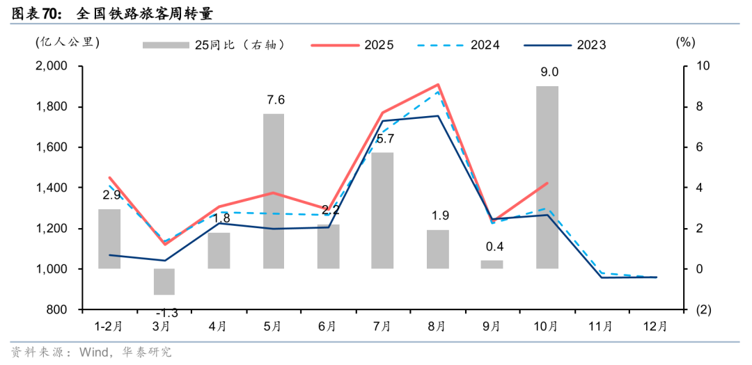 2025年铁路客运量稳健增长,但运距缩短。据国家铁路局,2025年1-10月铁路客运量、铁路旅客周转量分别同比+6.4%、+3.4%,反映了出行半径缩短。这或与高铁通达性提高、中产消费趋于保守、航空促销分流长途铁路客源有关。10M25铁路旅客周转量增速(同比+3.4%)低于民航国内线旅客周转量增速(同比+3.6%)。据航班管家,10M25首都机场至虹桥机场的航班座位数同比下降1.9%、客座率同比提高5.1pct,平均票价同比下降5.5%。在运距缩短背景下,铁路客座率等效益指标可能偏弱。